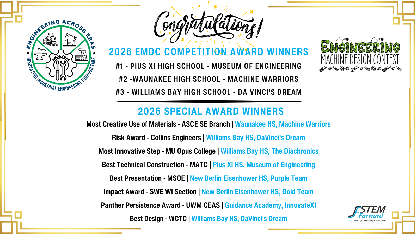 On March 13, 2026, the EMDC Milwaukee Regional at Discovery World brought together incredible energy, creativity, and dedication. A sincere thank you to all the teams for their hard work and innovation, to the judges for generously sharing their time and expertise, and to the sponsors whose support makes opportunities like this possible. Your contributions helped make the event a fantastic success. Best of luck to the teams advancing to the EMDC Championship at Minnesota State University, Mankato. We look forward to seeing you next year.